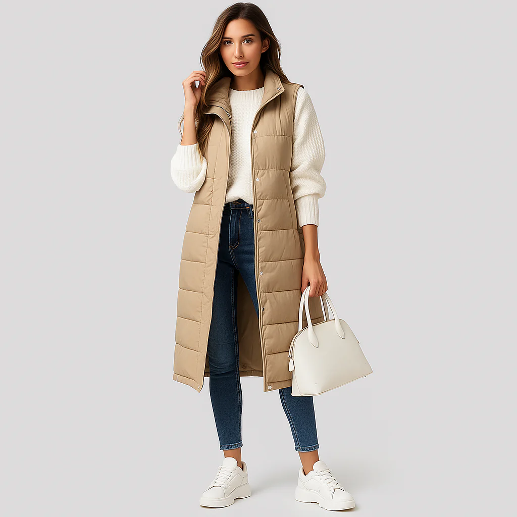 Notre gilet matelassé longueur genou allie chaleur et confort dans un design élégant.